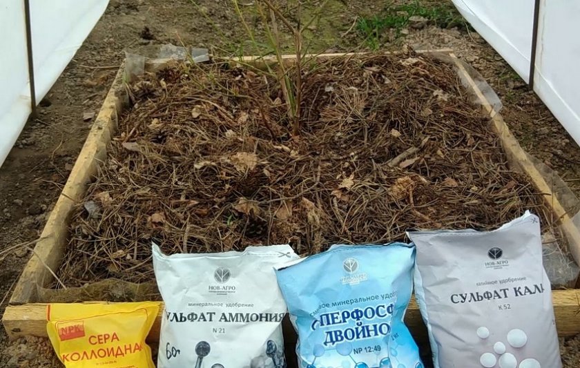 - Не можете да торите боровинките с органична материя, по-добре е да изберете сложни торове или комплекс от суперфосфат, магнезиев сулфат и амониев сулфат.