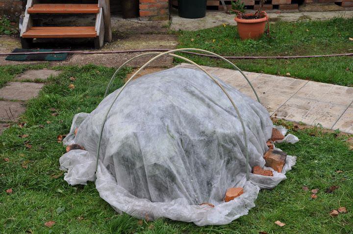 Тези опции обаче са подходящи за млади растения с гъвкави клони. Ако издънките вече са вдървени, те трябва да се увият в лутрасил и да се закрепят с тиксо. След това се изгражда защитен подслон от телена мрежа, като се монтира около растението. Той трябва да е с 20 см по-висок от храста. Запълнете цялото пространство вътре в мрежата със сухи листа и след това увийте конструкцията допълнително с пластмасово фолио.