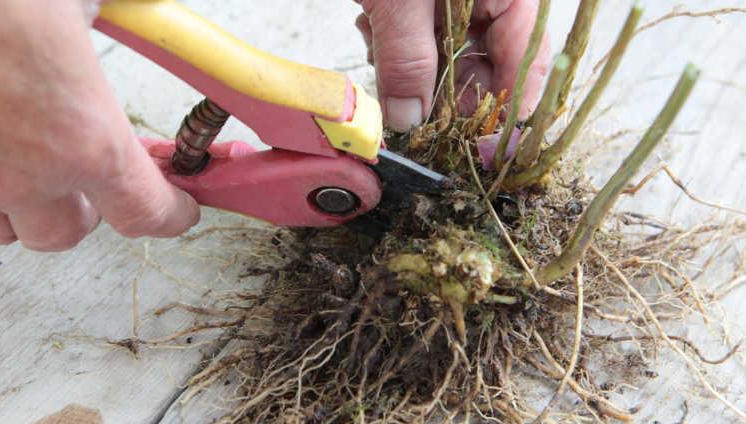 Това е особено удобно при презасаждане. Методът се отнася за всички видове, с изключение на метличестите сортове. След изваждане на разсада от почвата, коренът се разделя на няколко части, всяка от които съдържа както добри корени, така и силни, здрави издънки. За да се ускори заздравяването, разрезите могат да се третират с натрошен въглен.