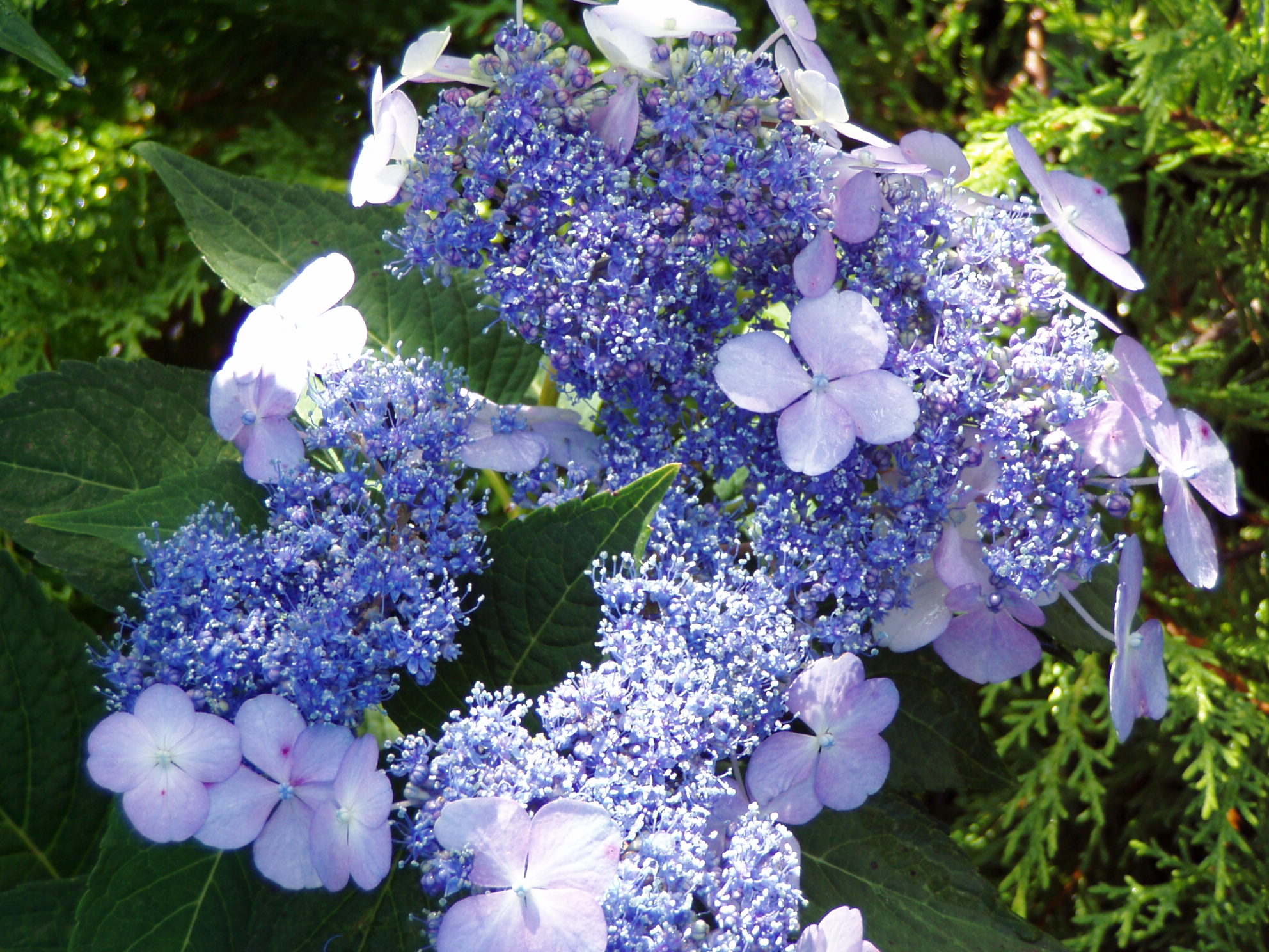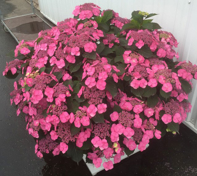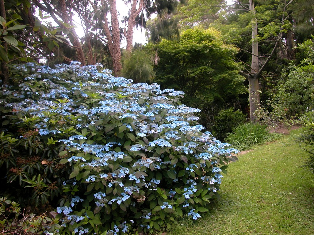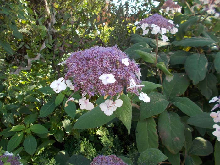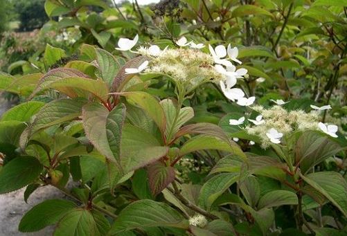 Отличителна черта са обилните, трионнообразни листа. Цветовете са едри и наситено оцветени (сини или розови). Събрани са в съцветие с форма на коримбоза, което достига 9 см в диаметър. Ако почвата е силно киселинна, цветът може да бъде ярко син. Първият период на цъфтеж настъпва в началото на пролетта, вторият - по-близо до есента. През септември листата променят цвета си и стават яркооранжеви. Недостатъкът на вида е лошата зимоустойчивост. Растението изисква добра защита от замръзване. |