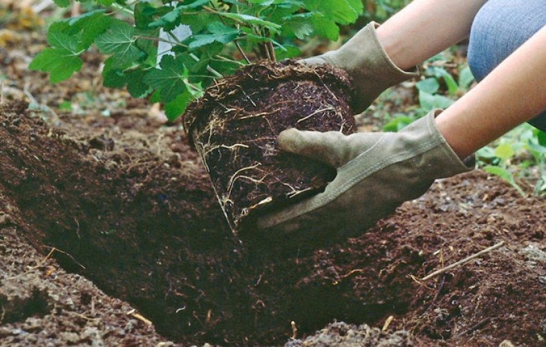 Ямата за засаждане трябва да е дълбока 40 см и да е с диаметър 50 см. Оставете приблизително 1,5 м разстояние между храстите. Преди засаждане пригответе хранителна смес: две части хумус, по една част компост, пясък и торф. След това обогатете субстрата със суперфосфат (60 г на 10 кг смес) и калиев сулфат (20 г на 10 кг смес). Напълнете подготвените дупки с тази смес и я оставете да престои няколко дни.
