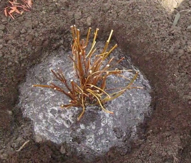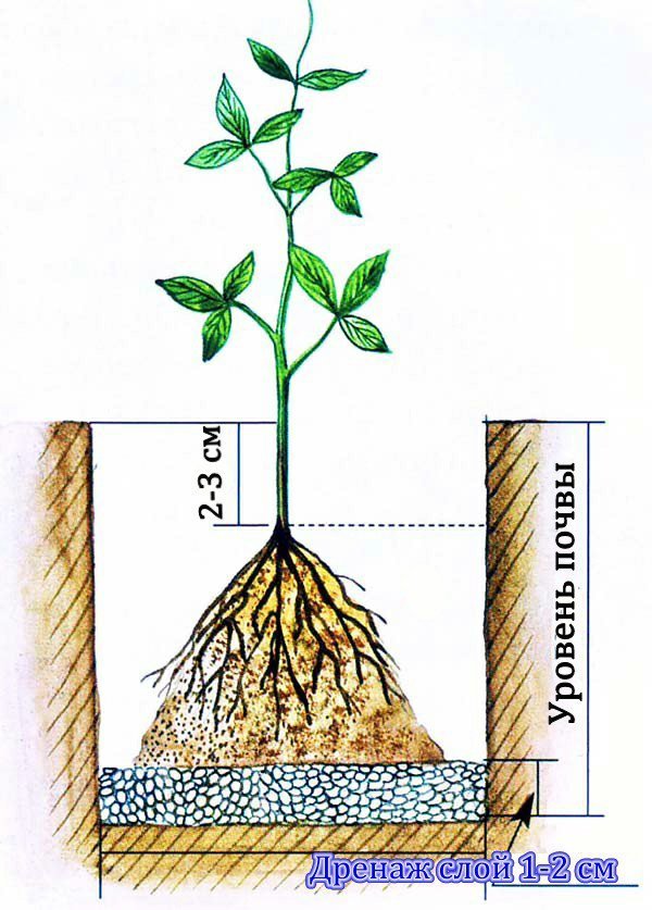 Разсадът се поставя в изкопа, корените се заравят в най-дълбоката част и почвата се уплътнява. След това всички издънки се подреждат във ветрилообразна форма и се покриват с почва. След това цялата площ се покрива с хумус или торф.