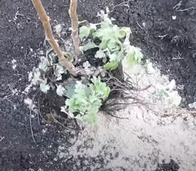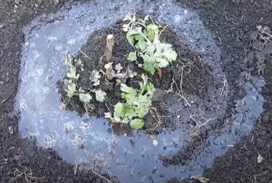 - Изсипете разтвор на Корневин и малко вода в новата дупка за засаждане.