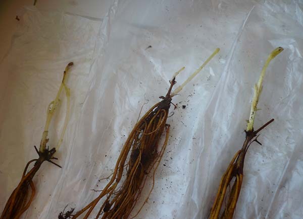 - Ако има признаци на гниене или мухъл по корените, отрежете тези области. Накиснете разсада във фунгицид.