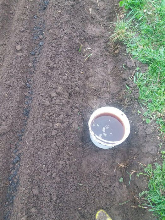 Поръсвам малко пепел по краищата, където ще засаждам лука, и го поливам с топла вода, смесена с калиев перманганат, който е останал от накисването му. О, и забравих да спомена: преди засаждане накиснах луковите семена в слаб разтвор на калиев перманганат.