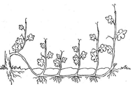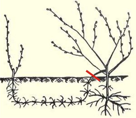 На следващата година, частта от растението в земята ще започне да пуска корени. От пъпките ще се появят един или два издънки. През есента, след края на вегетационния период, лозата трябва да се отреже по червената линия (вижте снимката по-долу). Разсадът, с вече оформени корени, трябва да се изкопае и засади където е необходимо.