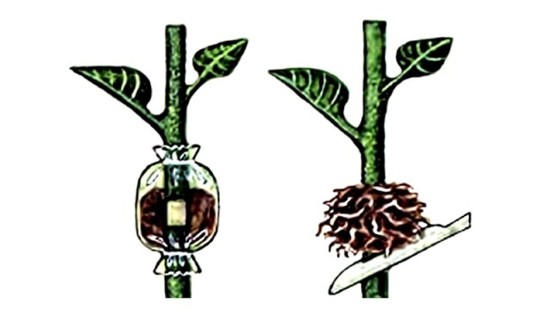 Освен това, можете да опашете издънката на мястото, отбелязано с жълтата линия на фигурата по-долу. Това ще забави загубата на хранителни вещества и ще ускори образуването на корени. Като алтернатива, вместо да опашете, можете леко да завържете издънката в основата с тел. Резултатът ще бъде подобен.