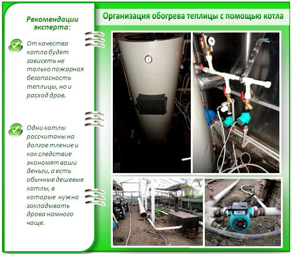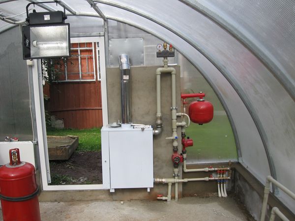 Ако се инсталира отделна система за отопление на оранжерия, е необходимо да се инсталира котел, който може да работи на газ, електричество или твърдо гориво.