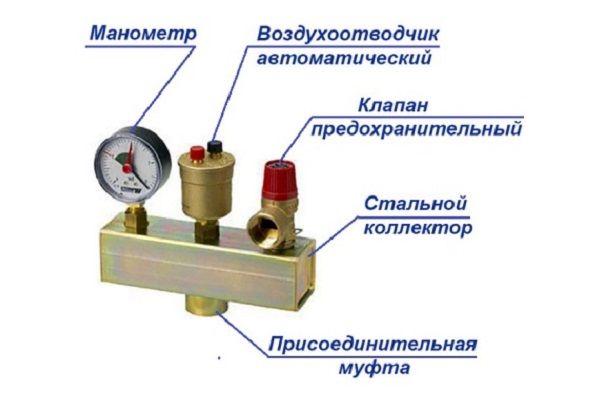 Включва манометър, предпазен клапан и обезвъздушител. Всичко това е монтирано на специален метален колектор, който е свързан към системата чрез съединител. Тази система трябва да бъде разположена непосредствено след котела, където температурата и налягането са най-високи.