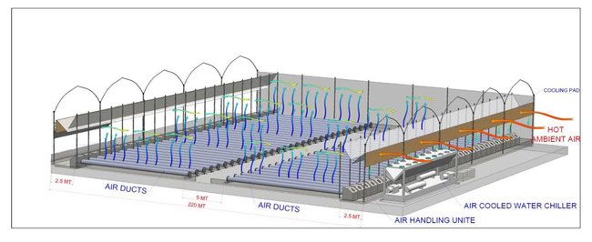 Иновативната технология в оранжериите от 5-то поколение разпределя въздушния поток през въздуховоди, осигурявайки прецизен климатичен контрол. Концентрацията на CO2 е равномерна в цялата оранжерия, с температурни вариации както в хоризонтална, така и във вертикална равнина от 1-2°C, което само по себе си е значително технологично постижение.