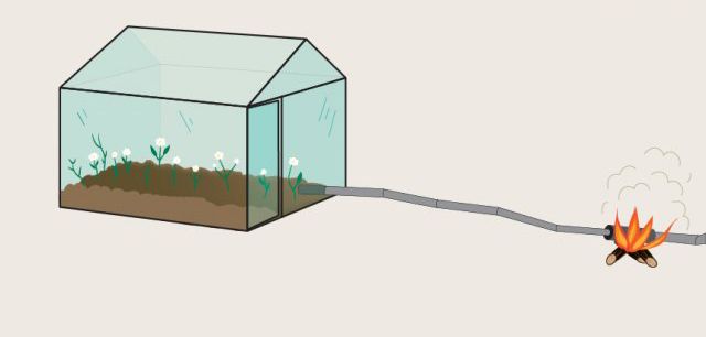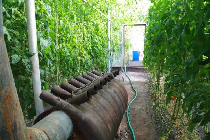 - Най-простият и примитивен вариант би бил подаване на въздух, загрят от огънЗа да се направи това, в центъра се монтира тръба с диаметър приблизително половин метър и дължина 2,5 метра. Единият ѝ край се простира извън оранжерията и в нея се подава горещ въздух.