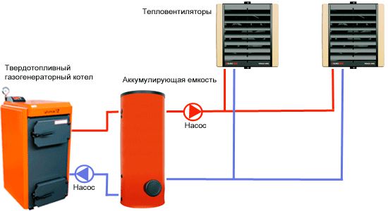 - Може да се използва топлогенератор, който доставя топъл въздух през полиетиленов ръкав. Монтира се на тавана и има перфорации. Основният недостатък на този вариант е невъзможността за ефективно затопляне на земята с въздух.