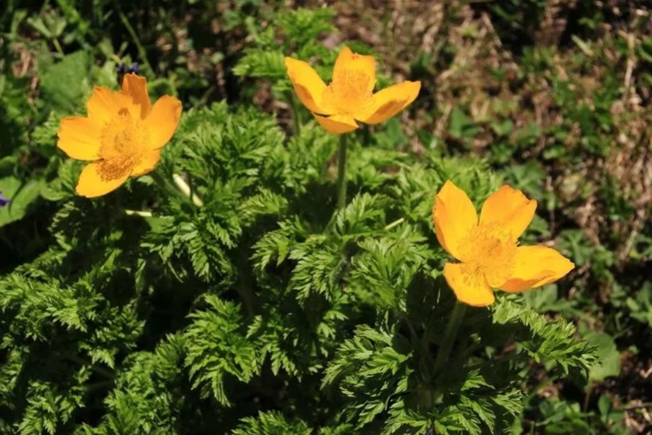 Пъстър вид, достигащ 35 см височина. Листата са дълбоко нарязани, гъсто опушени и разположени на къси дръжки. Цветовете са напълно отворени, жълтеникаво-златисти, с обиколка до 6 см. | Кавказки ендемит. | Декоративно и лечебно растение. |