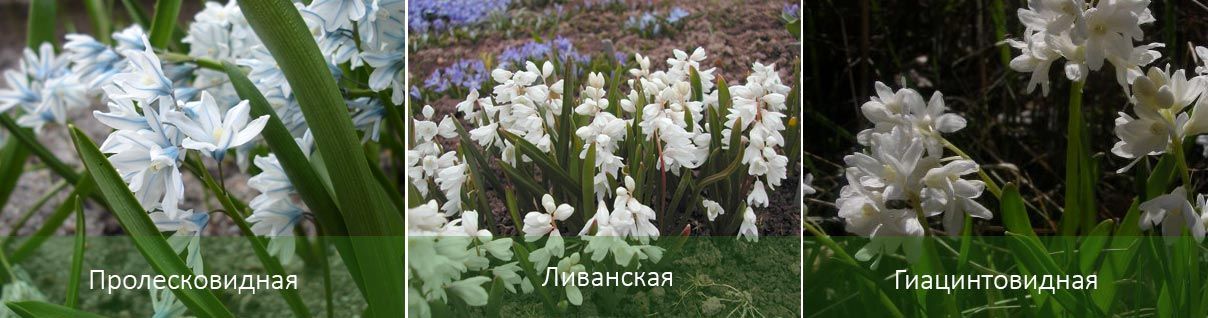 - Пушкиния (Pushkinia scilloides var. libanotica), подвид от семейство Сцилоидни (Scilloidea), се отличава с по-големите си цветове и шестзъба корона, образувана от слети дялове. Този подвид включва популярния сорт „Алба“, отличаващ се с доста големите си (до 8 см) чисто бели цветове.