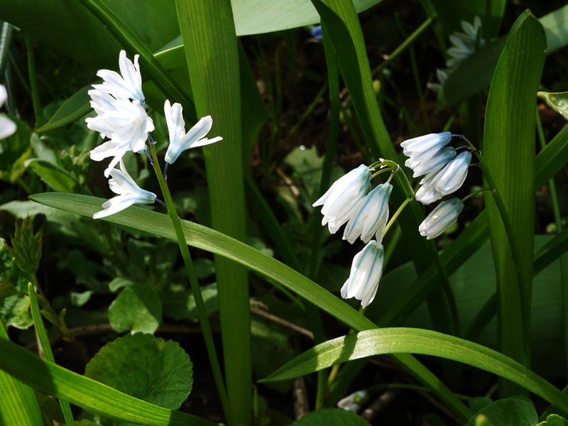 - Пушкиния сцилоидес (var. scilloides) има малки цветове, с размер около 2 см. Цъфти в края на април и май в продължение на 15-20 дни.