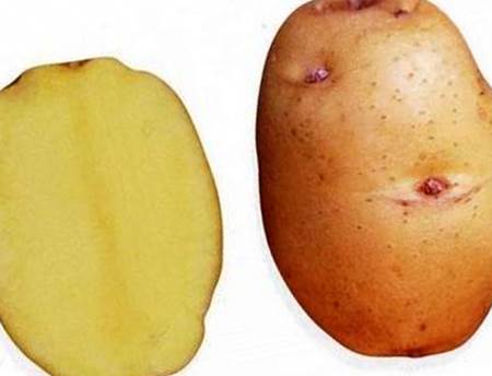 - КлубениОвална, с гладка жълта кора. Малки очи, малко на повърхността. Тегло на клубена 90-120 г. Жълта плът, потъмняваща при готвене.