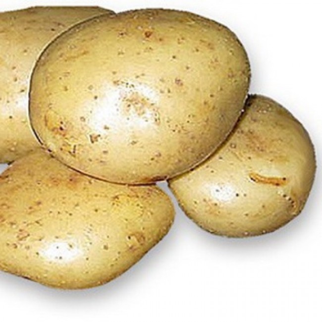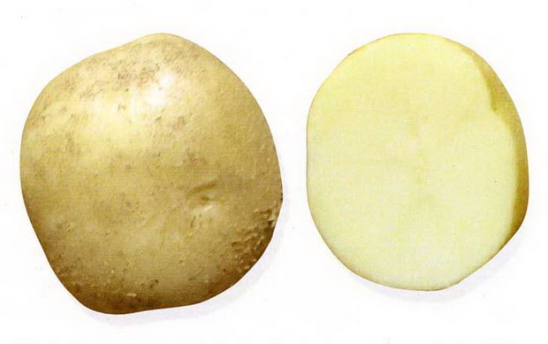 - КлубениПродълговато-овална, светложълта кожица с минимален брой плитки очи. Тегло 100-143 г. Светложълта плът.