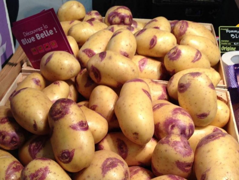 - КлубениОвално-кръгли, с тънка, но много плътна жълтеникаво-розова кожица. Сортът получава името си от сините очи на повърхността. Теглото на клубена е 70-195 г.