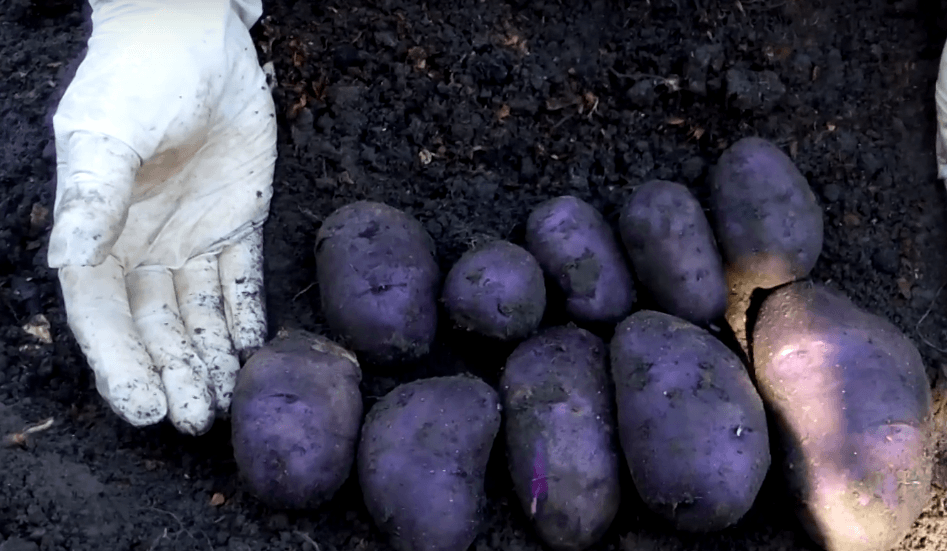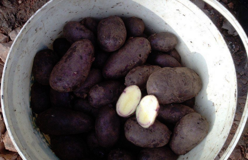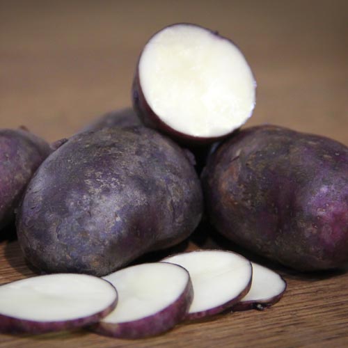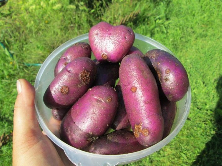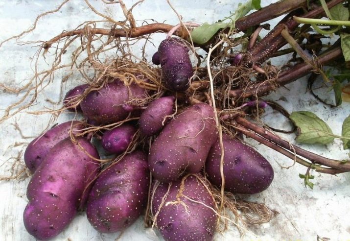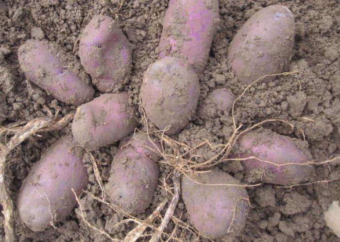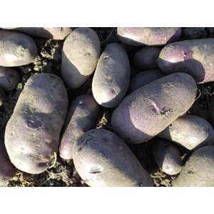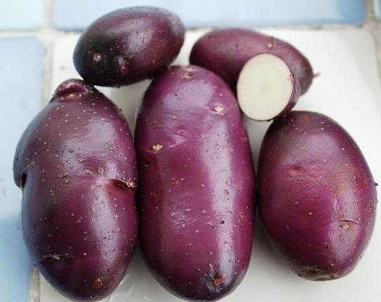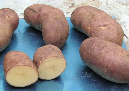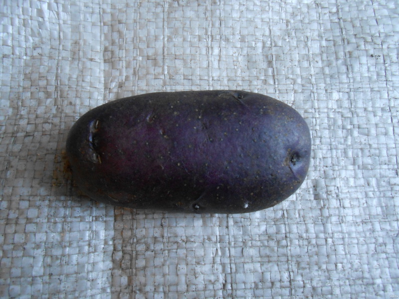 - Клубени: удължено-овална, гладка, с тънка синьо-виолетова кожица, с тегло 77-112 г. Месото е бяло до кремаво.