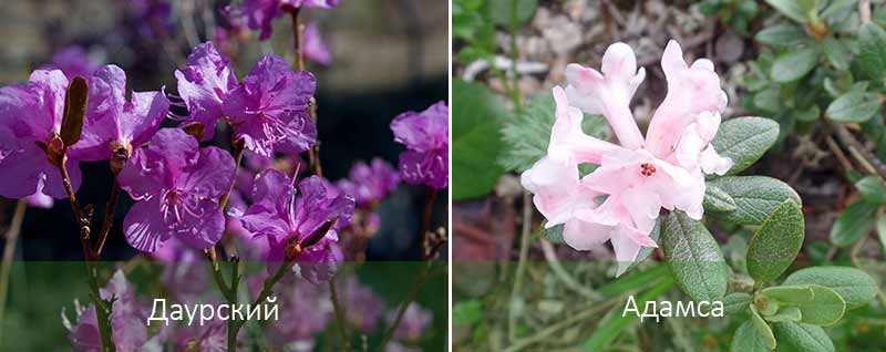| Даурски | Средно големи, силно разклонени, рано цъфтящи, кора със стоманен цвят, тънки, червеникаво-кафяви издънки с леко мъх. | Удължени, зелени, с лимонов цвят през есента. 5 см. | Лилаво-розово във формата на фуния. |