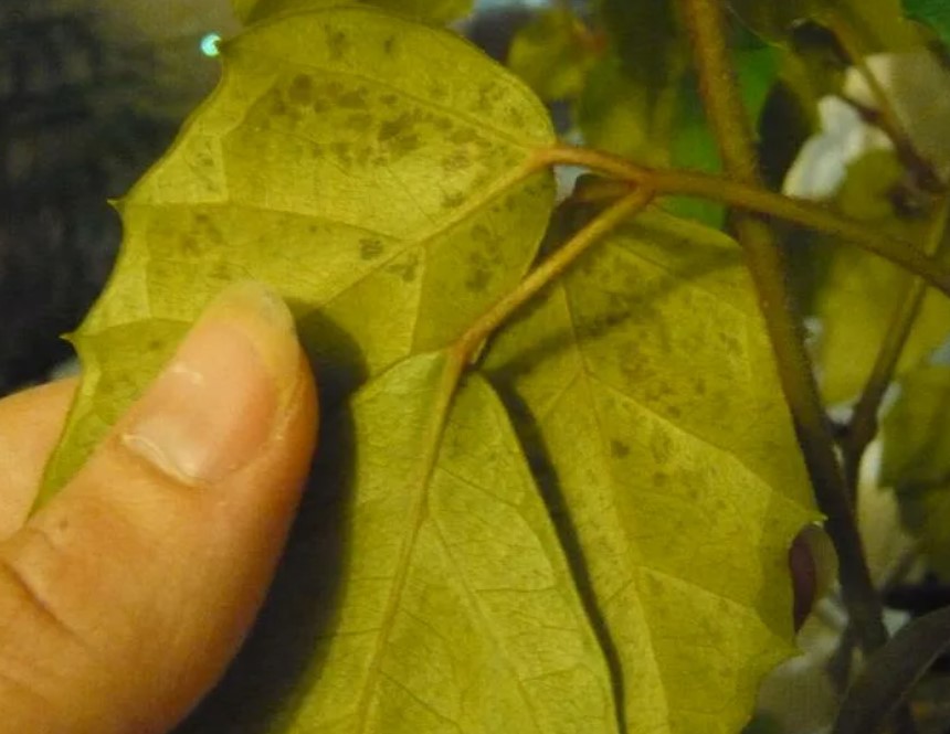 - Кафяви петна могат да се появят по листата поради горещи слънчеви лъчи. За да предотвратите това, предпазете храста от пряка слънчева светлина.
