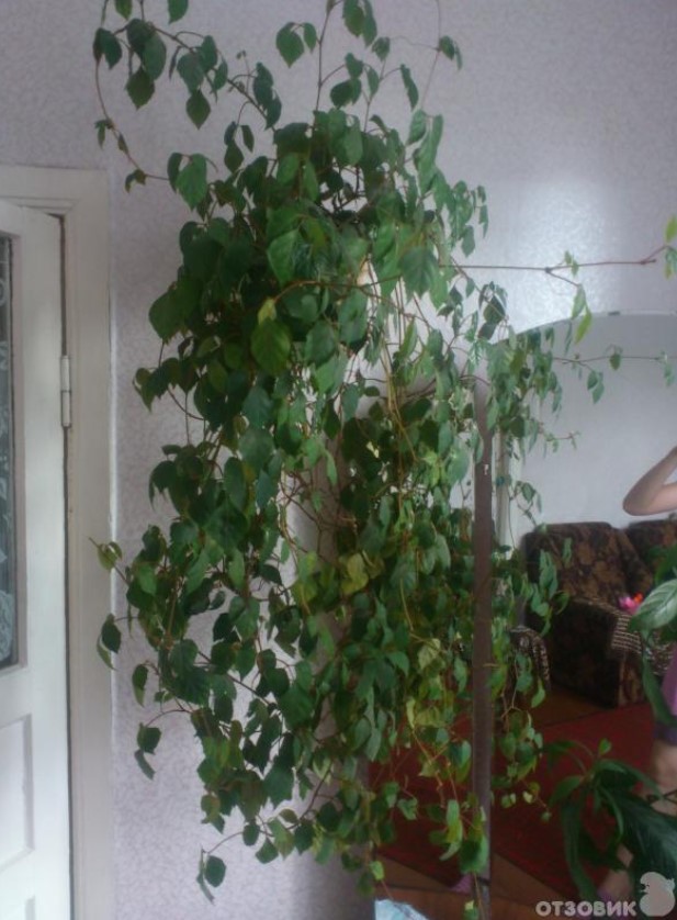 Това е увивно растение и може да се отглежда във висящи саксии, както правим тук. Тогава тънките му клони ще се спускат по стената, украсявайки я. Можете също да използвате това растение, за да украсите рамки на врати. Опънете въже, за да поддържате клоните, и го прокарайте през него. След това, когато брезата е достатъчно голяма, тя сама ще се изкачи по въжето, хващайки го с пипалата си (вероятно поради тази характеристика растението Rhoicissus се нарича още домашно грозде).
