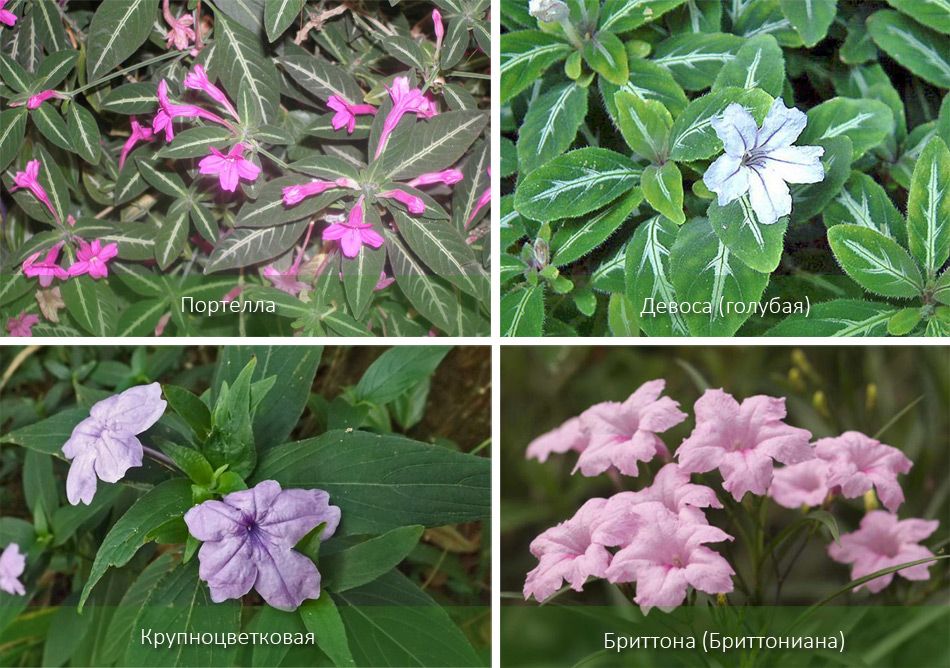 | Девоса (синя) | Разклонява се до 40 см. | Елиптична, кадифена, изумрудена със светли жилки, лилава в долната част (7 см). |