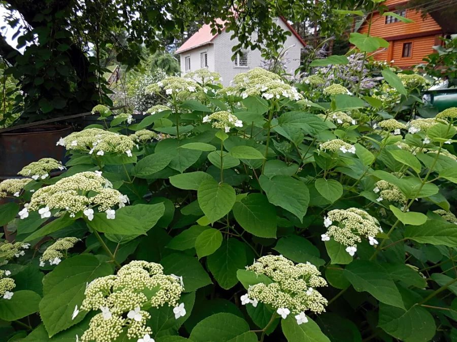 Хортензиите са лесни за грижи. Те са растения, изискващи ниска поддръжка.През лятото, особено в горещо време, храстите на хортензията трябва да се поливат обилно. След горещ ден листата на храста могат да загубят тургора, твърдостта си и да увиснат. Не ходим на вилата всеки уикенд, така че всеки път, когато я посещаваме, трябва да изливаме 2-3 кофи вода под всеки храст.