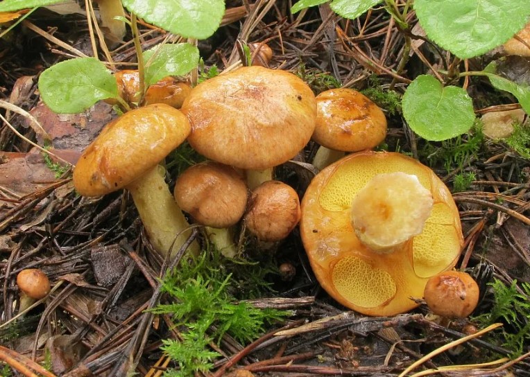| Шапката е с диаметър от 3 до 12 см и жълто-оранжев цвят. Кожицата е суха и става лепкава при повишаване на влажността. Пръчката е здрава, висока до 10 см и с диаметър до 2,5 см. Цветът над пръстена е жълт, докато цветът отдолу е същият като шапката. | Северна Америка, Европа, Западен Сибир. Расте редом със сибирски бор и кедри. | Юли-септември. | Ядлива гъба, използвана за мариноване. |