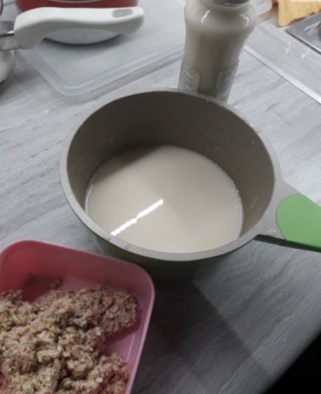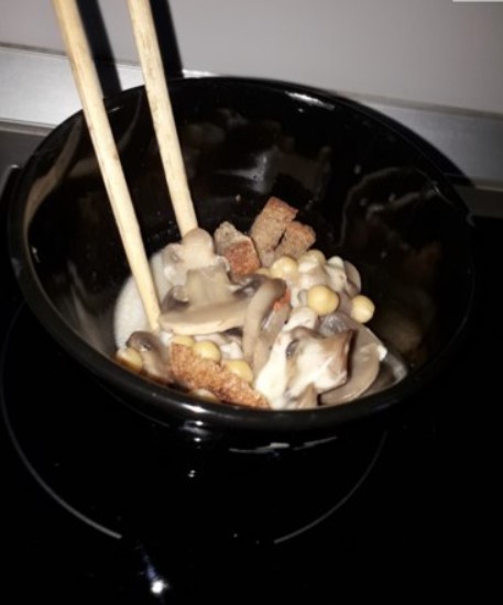 Нахут, гъби, крутони, оризово мляко, малко сирене