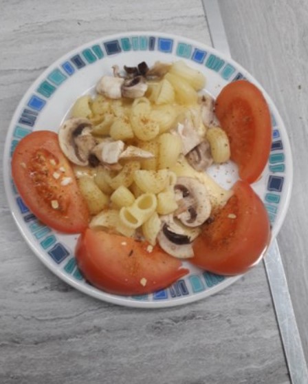 За закуска си направих здравословна порция овесени ядки с банан, а за вечеря ядох паста с гъби, сирене и домати.