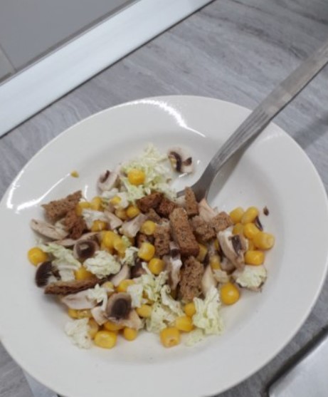 За закуска ядох банан. Мама направи супа от диви гъби и аз я ядох с крутони. За вечеря ядох салата от гъби, китайско зеле, царевица и крутони.