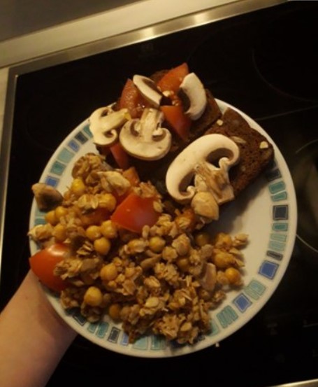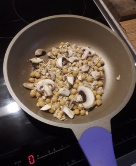 Направих си пържени овесени ядки (без олио, разбира се!) с нахут, гъби и домати. А също така си направих и сандвичи с подобни пълнежи. Направих си и овесено мляко и го изпих.
