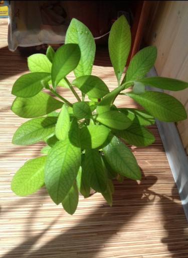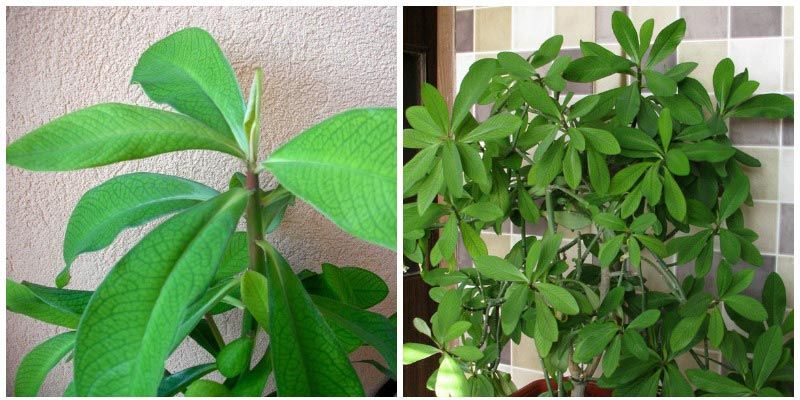 В началото нищо не се случи след този кошмар. Забелязах, че краищата на клоните започнаха да се свиват от среза, сякаш изсъхват (в крайна сметка изглеждаха като тези на снимката по-горе). Но след това, малко по малко, тук-там започнаха да се появяват нови издънки. Радостта ми не знаеше граници. Сега те са се превърнали в листа като тези.Синадениум Рубра