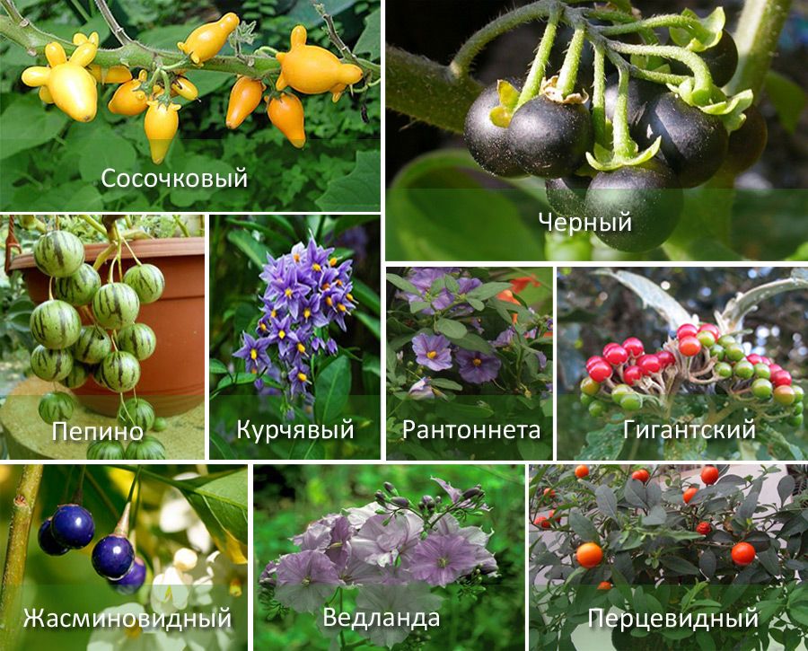 Има много разновидности на соланум, всички идеални за отглеждане в оранжерии, первази на прозорци или зимни градини. Те се различават по цветовете, плодовете, размера на зелената част и дължината на лозата:
