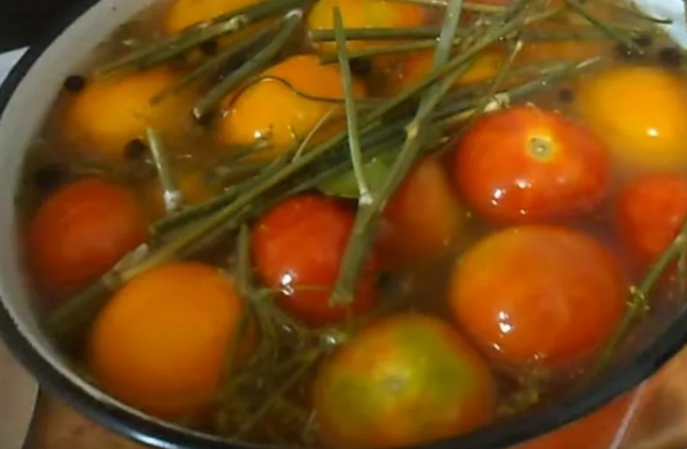 Жената, от която поисках рецептата, пробожда домати с игла, но аз ги разполовявам. Взимам червени, твърди. Така че, разполовявам доматите и ги слагам в тенджера. В друга тенджера кипвам вода. Когато заври, за около 1,5-2 литра вода добавям 7-8 скилидки чесън, една супена лъжица сол, една супена лъжица захар, червен пипер, зърна черен пипер, около половин чаша оцет и билки (копър, магданоз, целина).