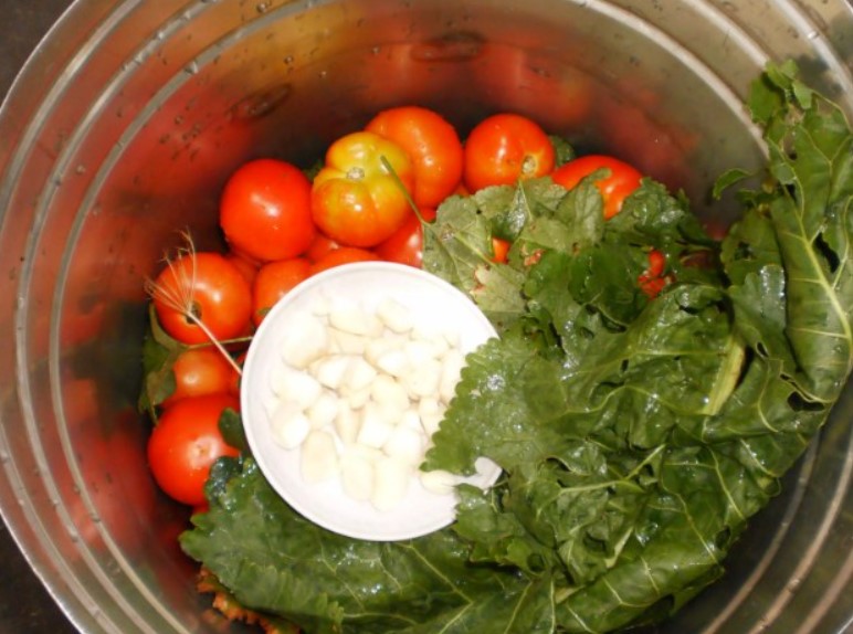 - Поставете зелените зеленчуци и доматите в кофа. Зелените зеленчуци трябва да са първият и последният слой.