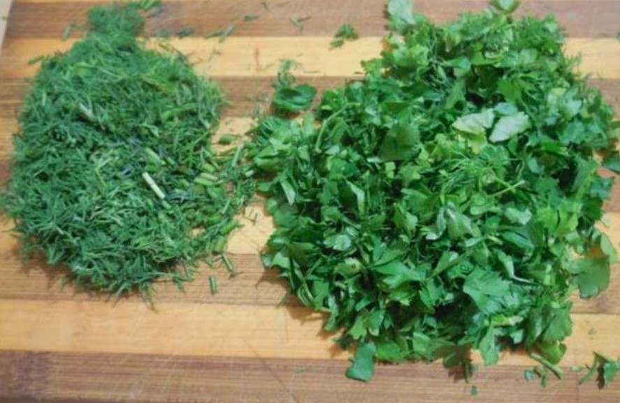 Нарежете магданоз и копър (по 1 връзка от всеки) заедно с чесън (1 глава) и люта чушка (2 броя).Как бързо да обелите чесън