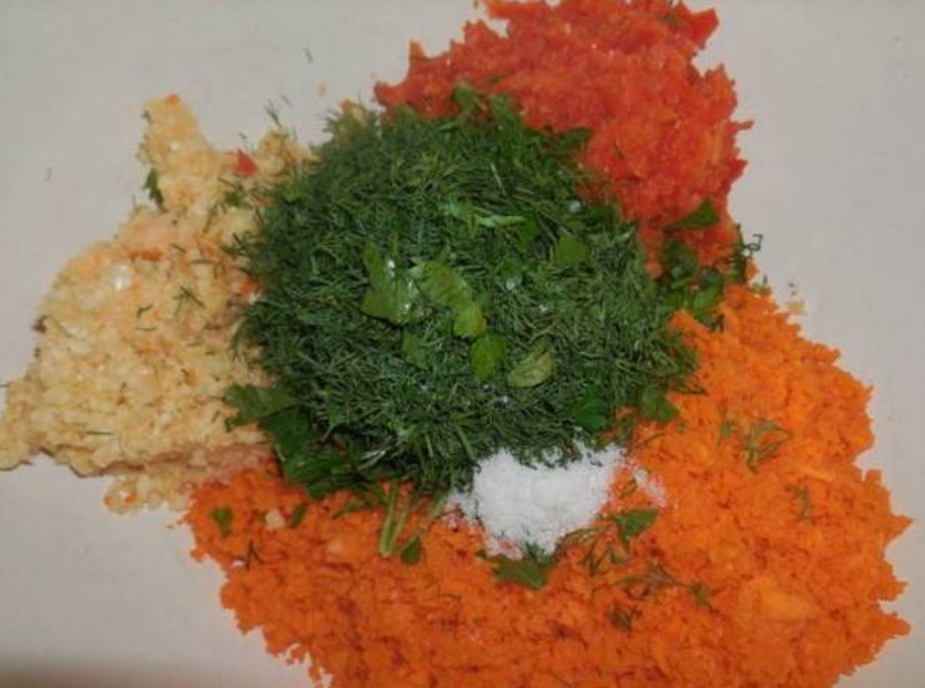 - Смесете всички нарязани зеленчуци и билки в купа. Добавете 1/2 чаена лъжичка сол и разбъркайте добре до гладкост.