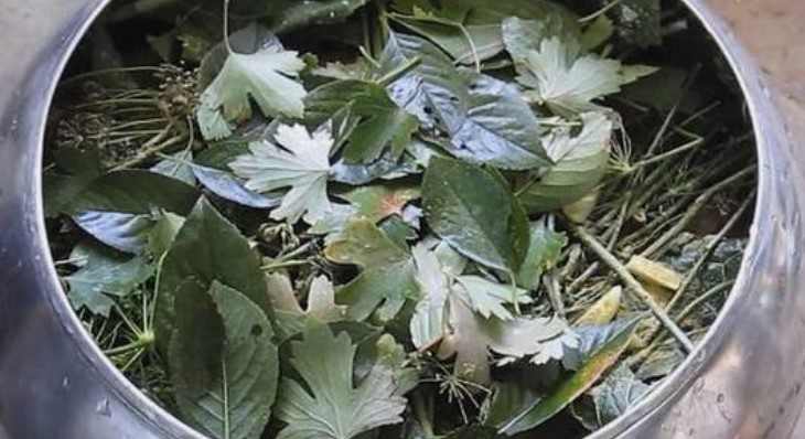 - Поставете слой от лозови листа, касис, хрян и черешови листа, целина, мента, магданоз и измити скилидки чесън.