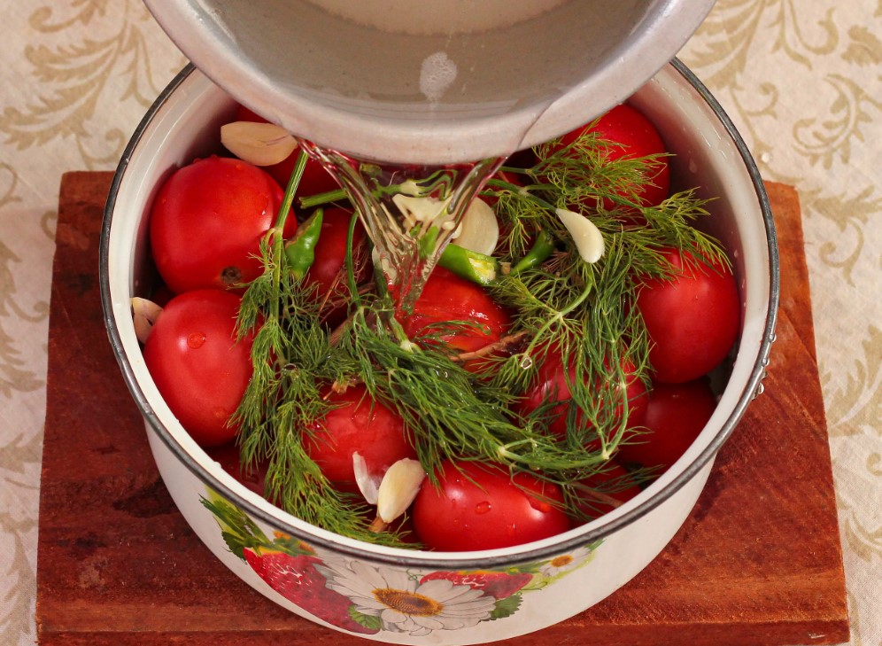 - В отделен съд разтворете 50 г готварска сол в 1 литър питейна вода. Залейте доматите с подсолената вода, докато се покрият напълно.