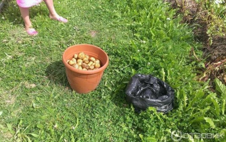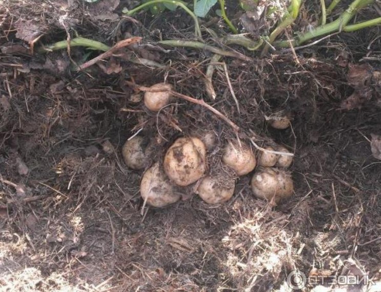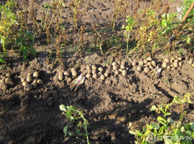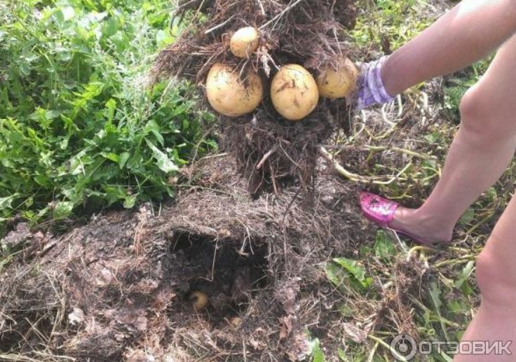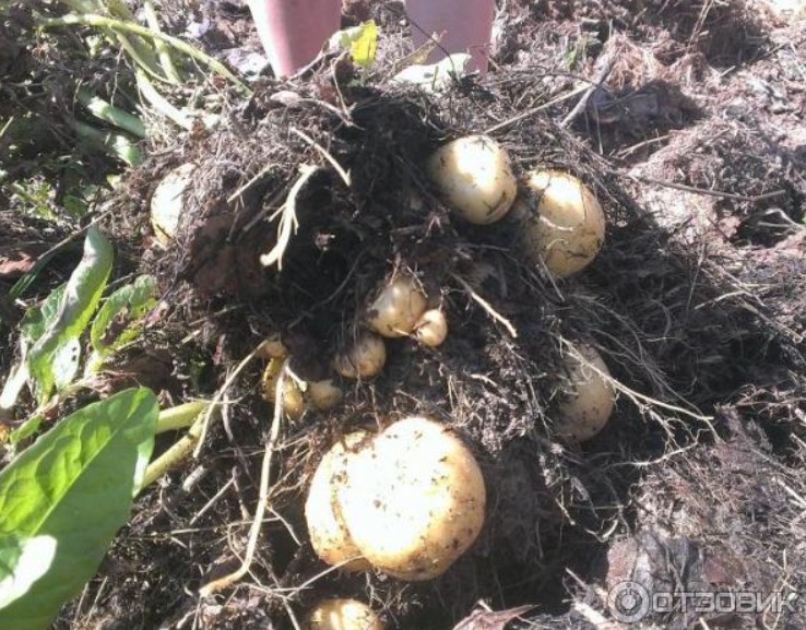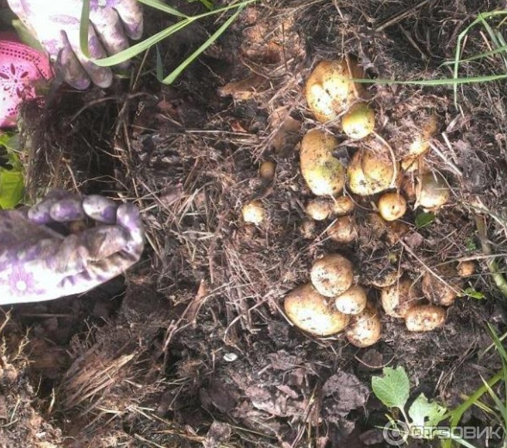 Започнах да изравям нови картофи за семе на 18 август. По това време връхчетата на този сорт бяха изчезнали. Не съм сигурен дали късната мана ги е изяла, или връхчетата са изчезнали, защото картофите вече са били узрели, тъй като Адрета е средно ранен сорт. Ето какво получихме. Могилата е едно растение. Картофите се получиха със среден размер, няма малки, но няма и гигантски.