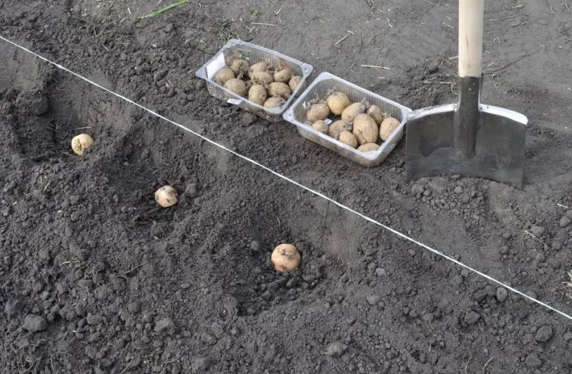 След като полето е изорано и изравнено, се изкопават окопи на дълбочина 20-25 см. Картофите се подреждат на препоръчителните интервали и след това се покриват с пръст.