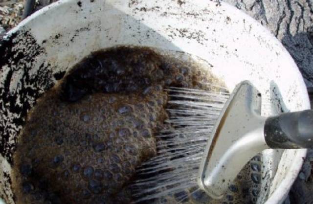 - Когато върховете достигнат височина 15-20 см, нанесете органичен тор, състоящ се от 1 литър лопен, настояван в продължение на една седмица в 10 литра вода. Полейте всеки храст с 0,5 литра от тора.