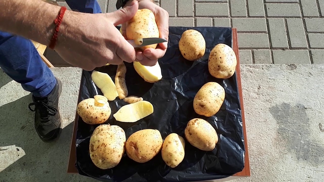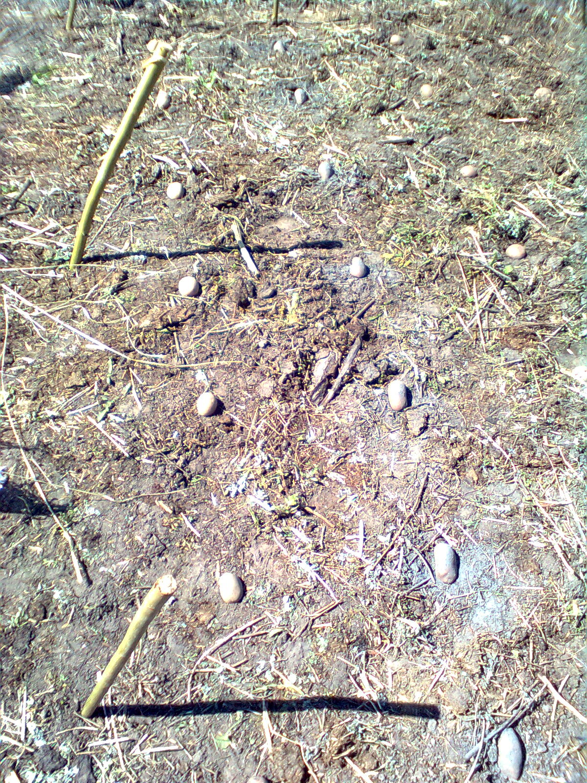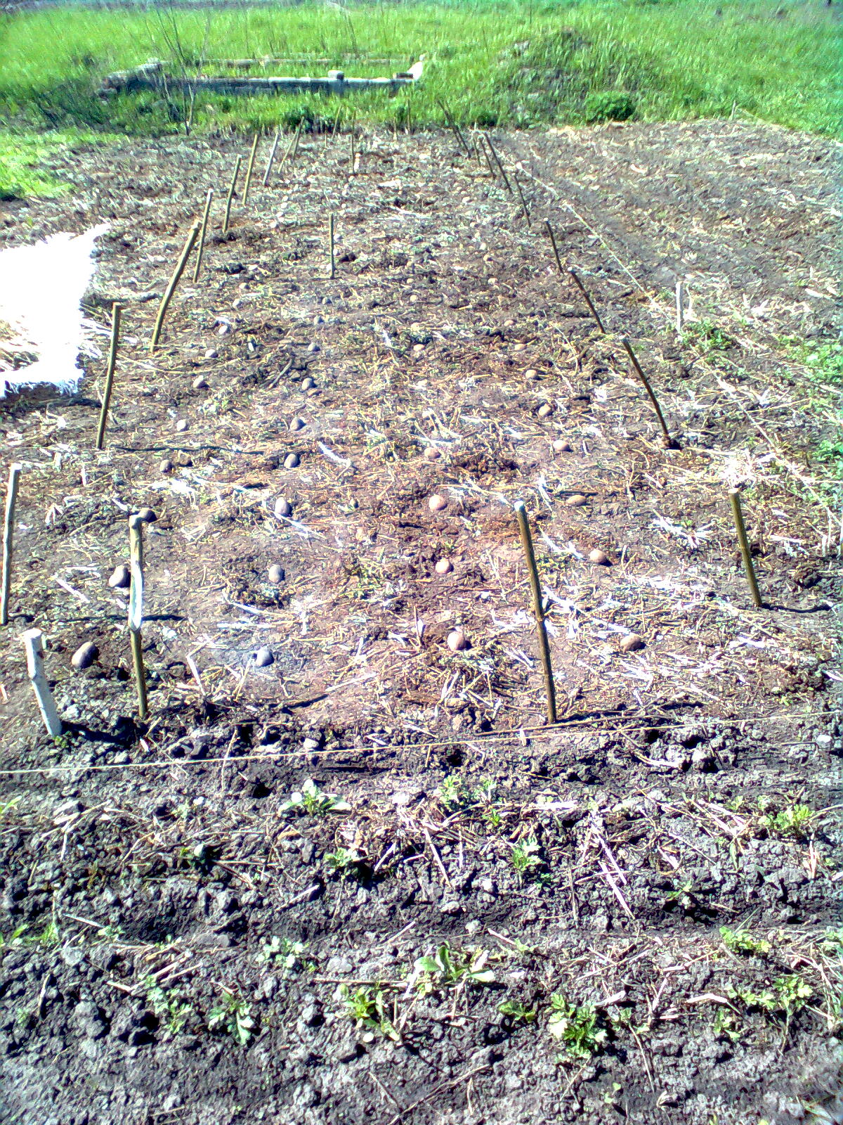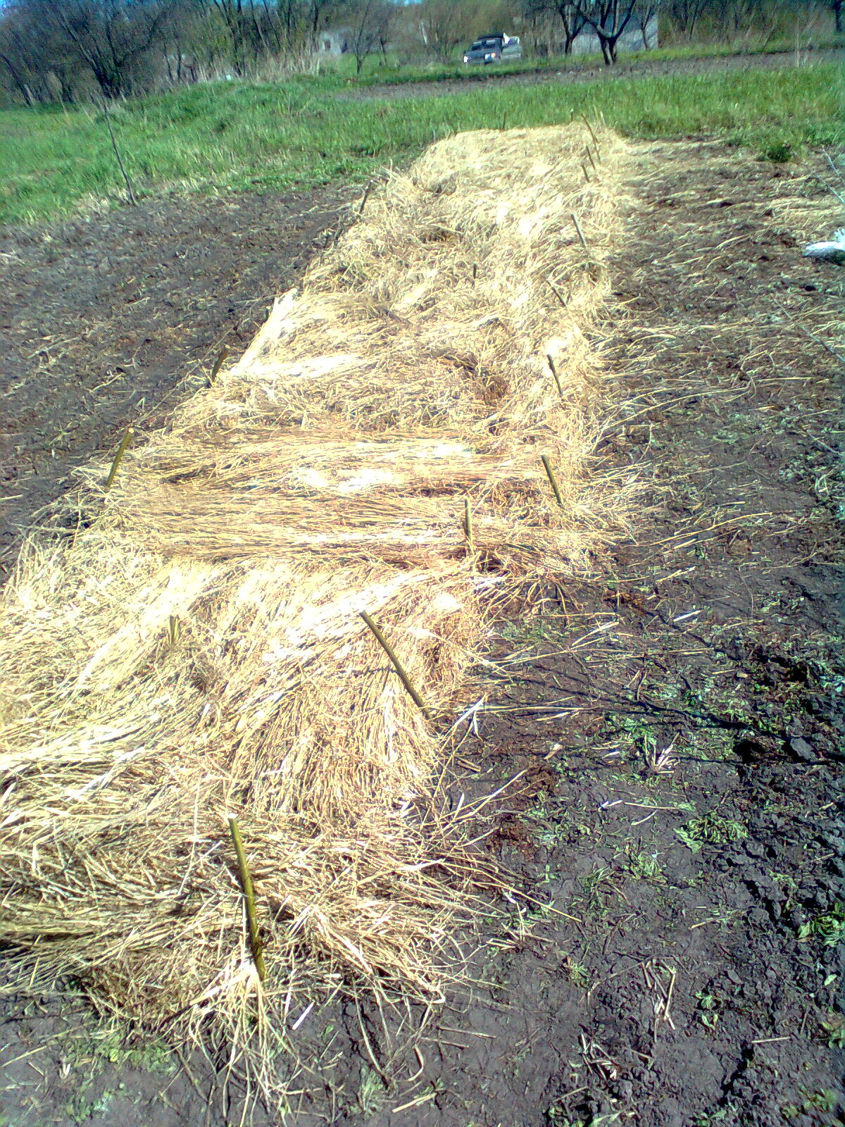 Засадих само 4 реда (128 малки половинки картофи) — нямаше достатъчно слама за повече. Общо половинките бяха: 62 от беларуския сорт Журавинка, 26 от ранния холандски сорт. Моли12 холандски картофа Моцарт, 14 от неизвестен израелски сорт, купен от Магнит за хранителен, а не за семе, и 14 от неизвестен розов продълговат сорт, също купен от Магнит, доставен там от някаква московска компания. Разрязах картофите по дължина, като се стараех да оставя равен брой очи на всяка половинка, потопих пресните разрези в пепел и ги положих с разрязаната страна надолу на земята, след което ги покрих със слама.
