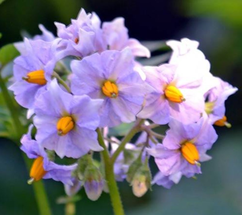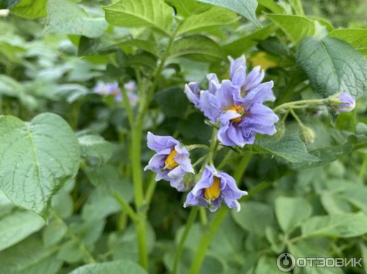 И отново очаквайте изненада. Картофите цъфтят обилно с красиви сини цветове. Но като правило почти всички от тях окапват, без да дадат плод. Плодовете са много редки. Само от време на време се появяват изключения, които не мога да обясня. Може би е имало някакво опрашване от насекоми, подходящи за сорта. Но такива храсти са доста забележими. Дори ги маркираме специално, като забождаме пръчици с червени панделки, завързани наблизо. Основното е да не се изгубят семената.