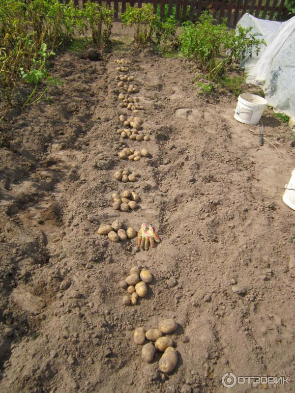 Грудките се поставят с кълновете нагоре в предварително подготвени дупки, разположени на разстояние 35 см една от друга. Препоръчително е да се остави разстояние от 60-70 см между редовете, за да се улеснят последващите грижи.