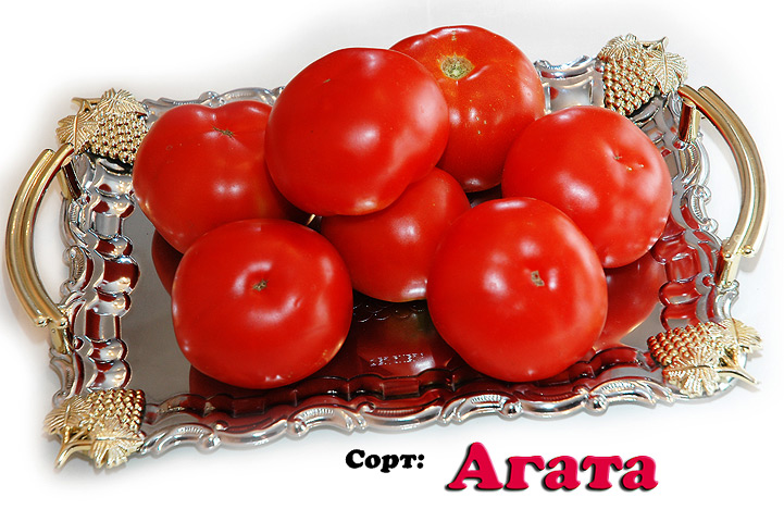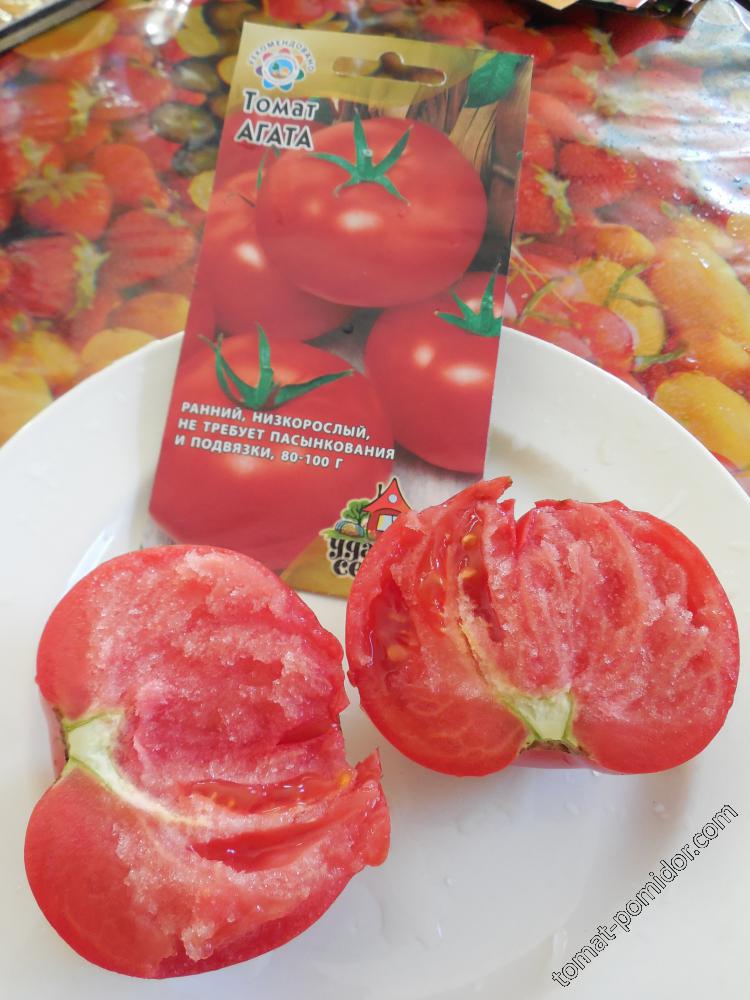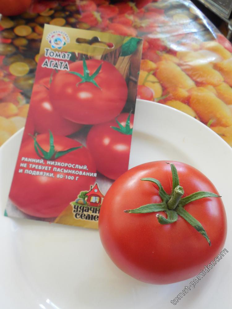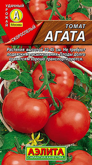 Домат „Агата“. Ранен сорт за салати. Вегетационният период е 110 дни. Детерминантното растение расте до 45 см височина и не изисква подпъхване или прищипване. Плодовете са плоско-кръгли и гладки. Лесни са за транспортиране. Теглото на плодовете варира от 80 до 110 г. Този сорт дава често плодове.