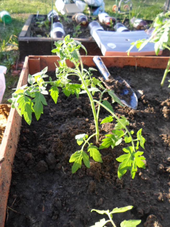 Пресадих покълналите семена на домата Агата в сандъче с почва.