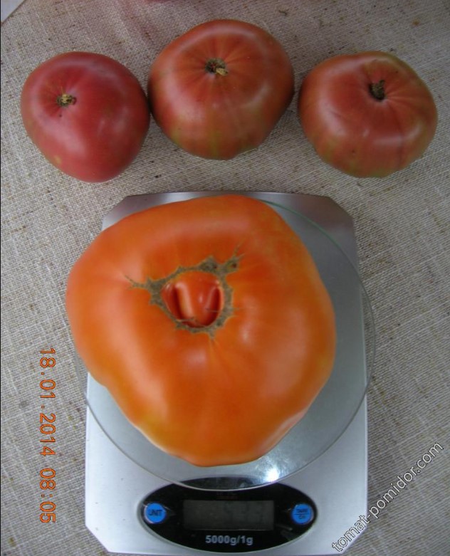 Доматените храсти са високи и енергични. В оранжерии могат да достигнат до 2 метра. Този сорт дава плодове по цялата си височина. Взискателен е към условията на отглеждане. Средното тегло на домата е 200 грама. Дори когато узреят, цветът е розово-червен, а месестата част е сочна със сладко-кисел вкус. Може да се използва само в салати. Растението е чувствително към ниски температури и недостатъчна влажност. Изисква много светлина. Трябваше да работя усилено върху този домат, за да го запазя, но той ме възнагради с добра реколта. Грижите включват поливане, разрохкване на почвата, плевене, различни торове и навременно подрязване на листата. Отглеждайте в оранжерия и използвайте капково напояване в корените.